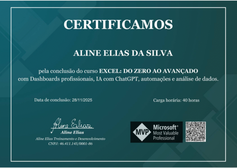 Reconhecida como Microsoft MVP, Aline já ajudou mais de 30.000 alunos a deixarem de ser “invisíveis” e passarem a ser reconhecidos como referência dentro das suas empresas, com planilhas mais inteligentes, menos retrabalho e mais resultados.